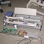 最近、印刷しているとプリンターが途中で印刷エラーで停止してしまうfーー; どうも何処かの接触が悪い感じ。USBケーブルを交換しても直らないのでプリンター本体内部のようである…順に分解していくと無事基盤が取り外せました。よく見るとUSBコネクタ裏のハンダがなんとなく浮いている。このせいでプリントヘッドが左右に動く振動によってリセットされたと断定。早速その付近のハンダを数カ所やり直したあと組み立てて動作実験。やったぁ止まらなくなったぁ〜(^^)V 正直言ってCDプリントのできるプリンターに買い換えようかなと思ってたのですが、何とか直ったしA3対応の奴は6万円以上なのでなかなか思い切れない(苦笑)